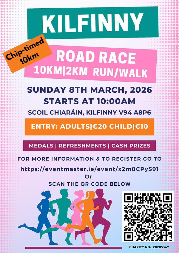 Use the QR code on the poster or the following link https://eventmaster.ie/event/x2m8CPyS91 to book your tickets or you can donate to the cause at this link https://eventmaster.ie/fundraising/campaign/kilfinny-n-s-road-race-2026