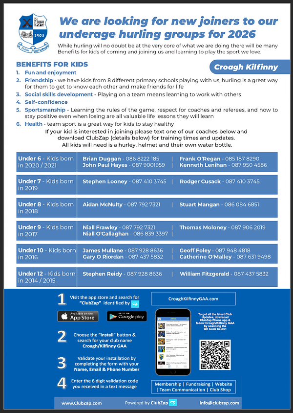 Players will need to be registered on Foireann and parents will be added to the relevant teams ClubZap group.